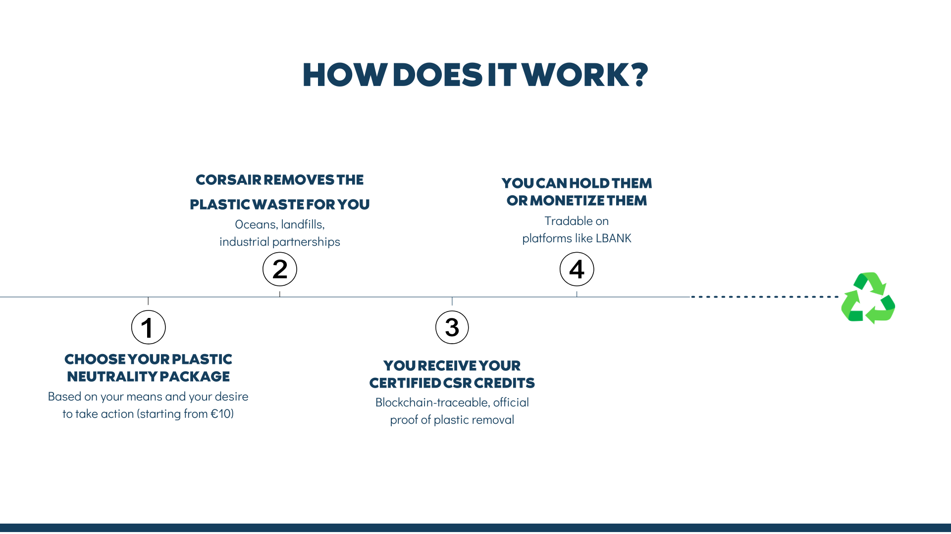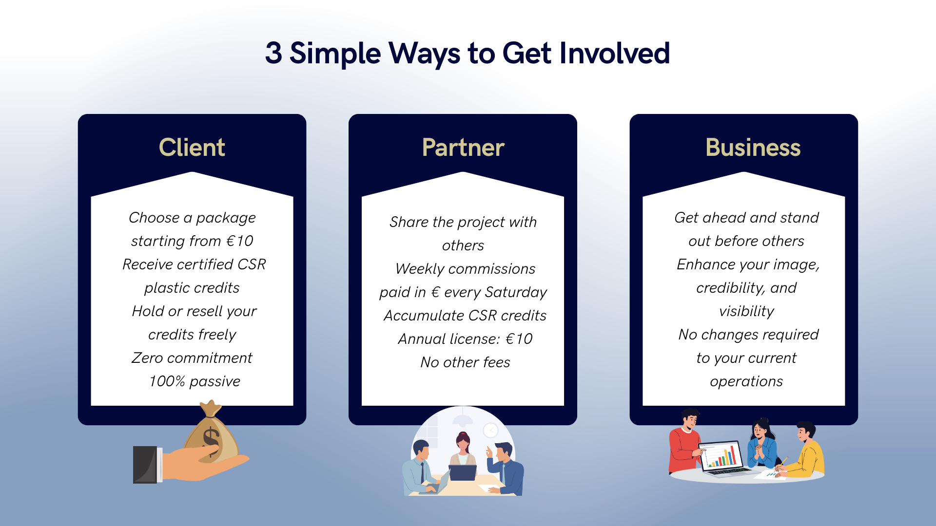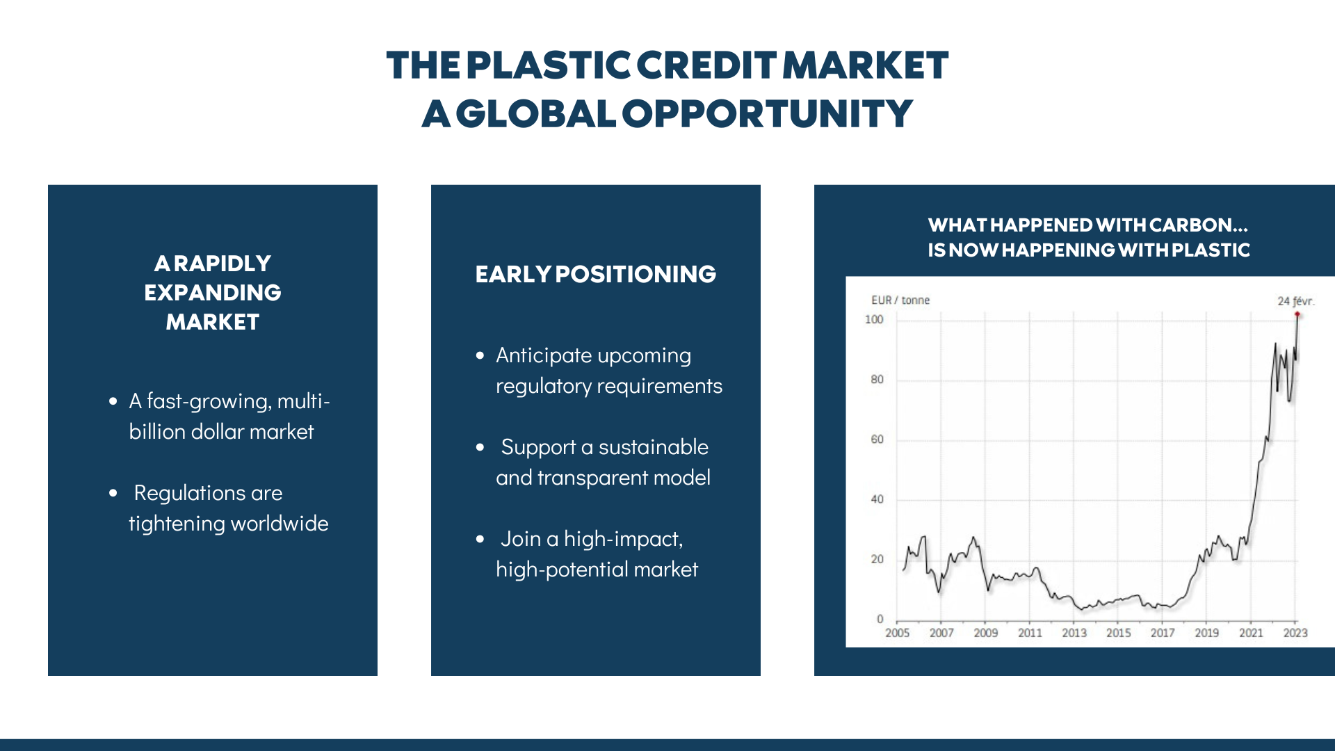 We offer individuals and businesses the opportunity to position themselves in the multi billion dollar certified plastic credit market, a market complementary to carbon credits, while taking concrete action for the environment from home through a one time purchase.